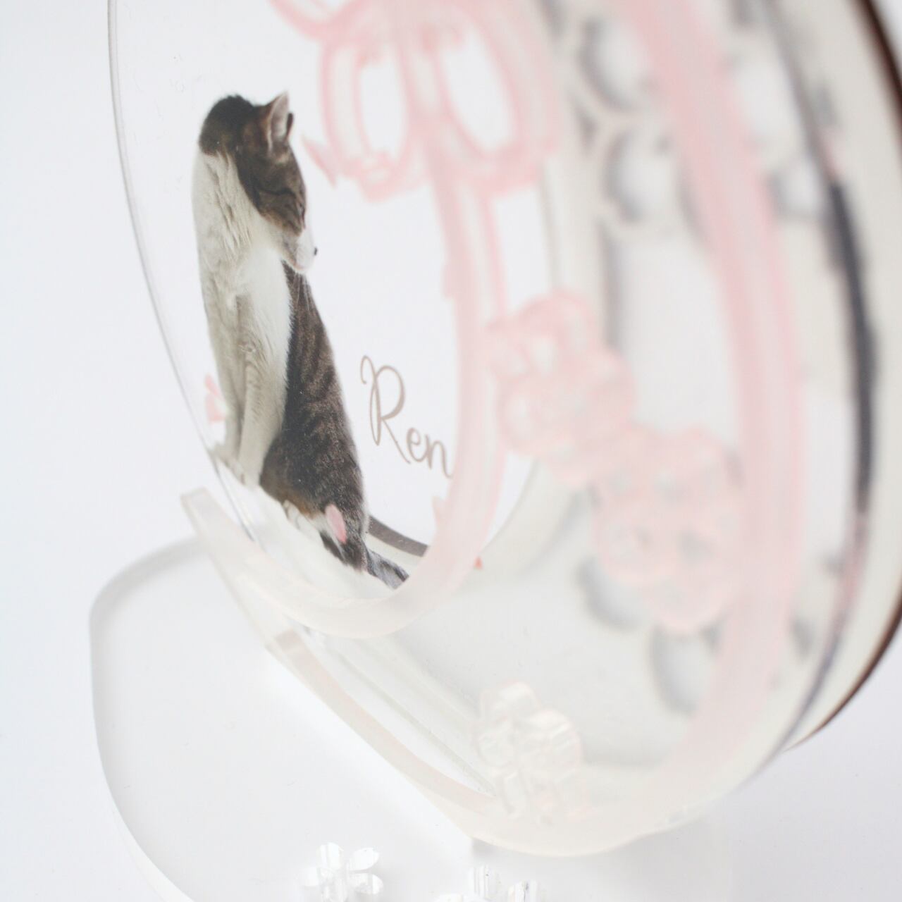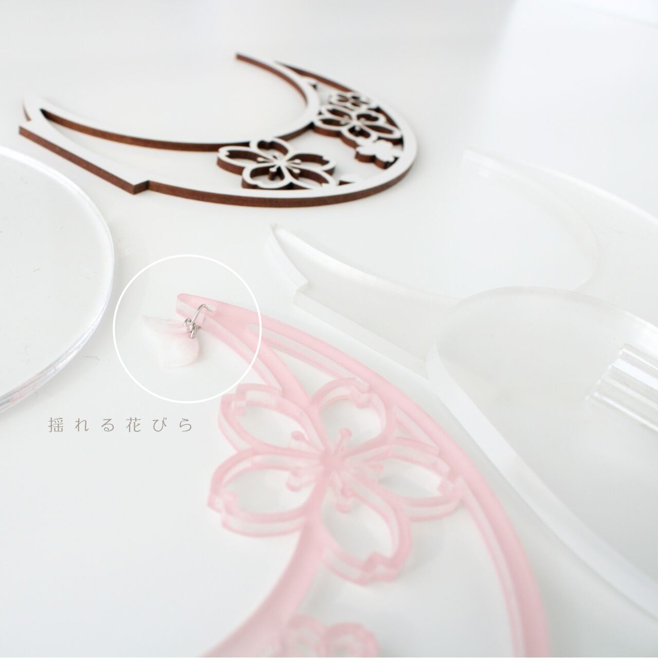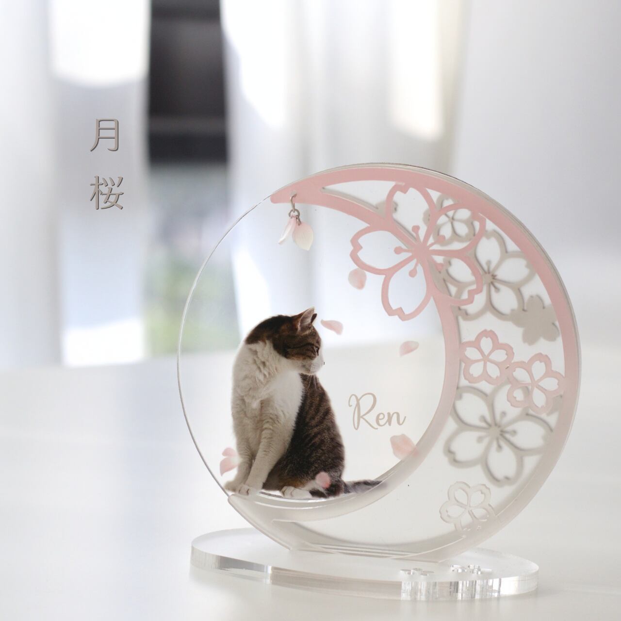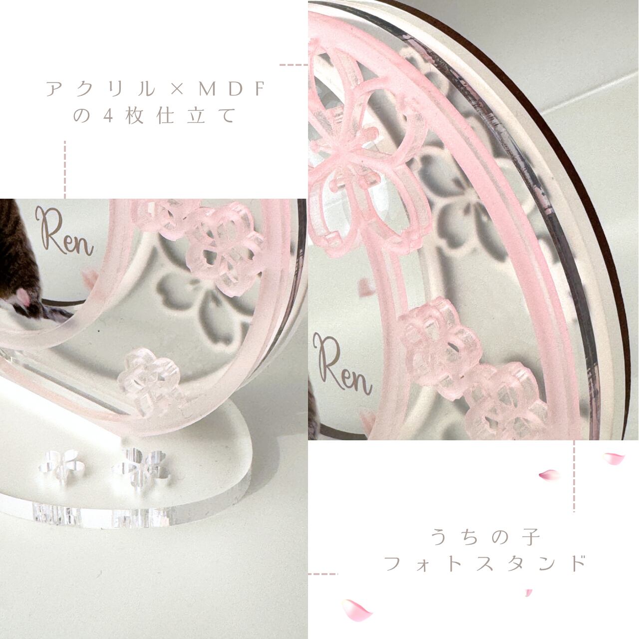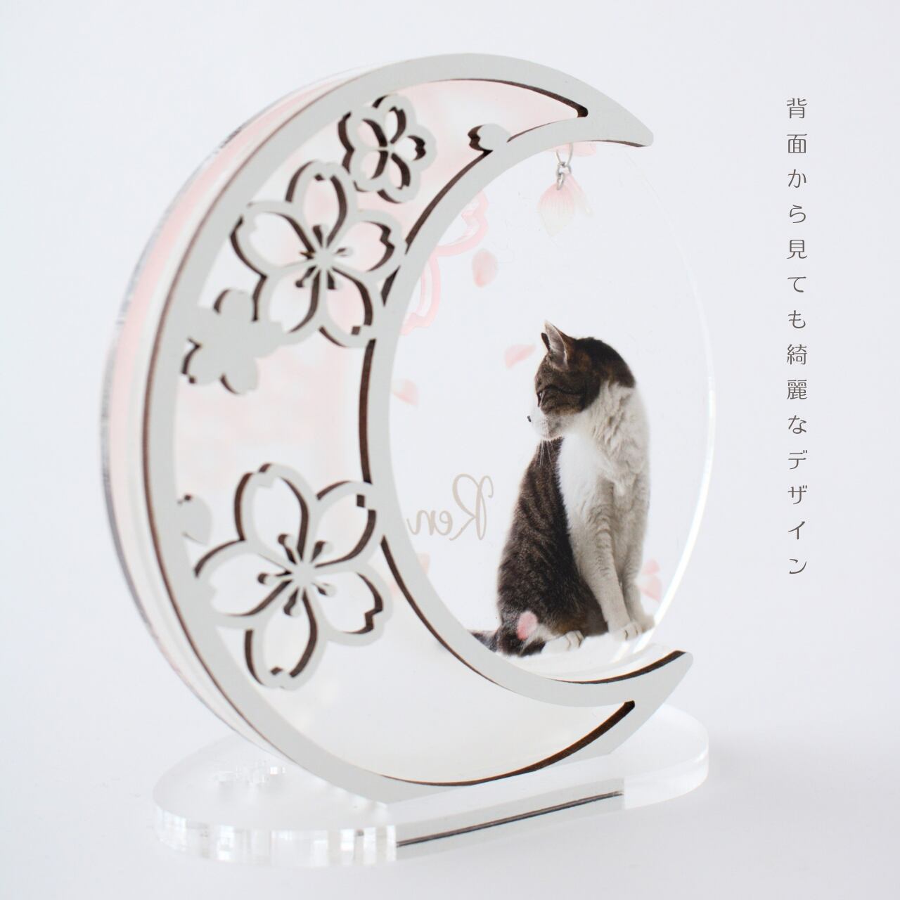 重なるアクリル×MDFで仕上げた 月と桜のフォトスタンドです。 優しく咲いた桜と一緒に うちの子の写真と名前をお入れします。 桜の季節だけでなく、 桜好きな方はへの贈り物にもおすすめです。 【素材】 アクリル、MDF 【サイズ】 約11cm